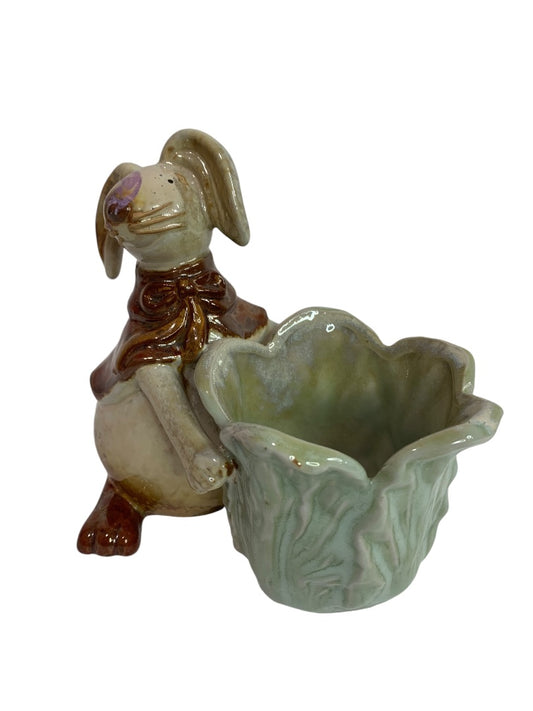 Vintage Bunny Rabbit Art Pottery Holding Lettuce Bowl Figurine Signed