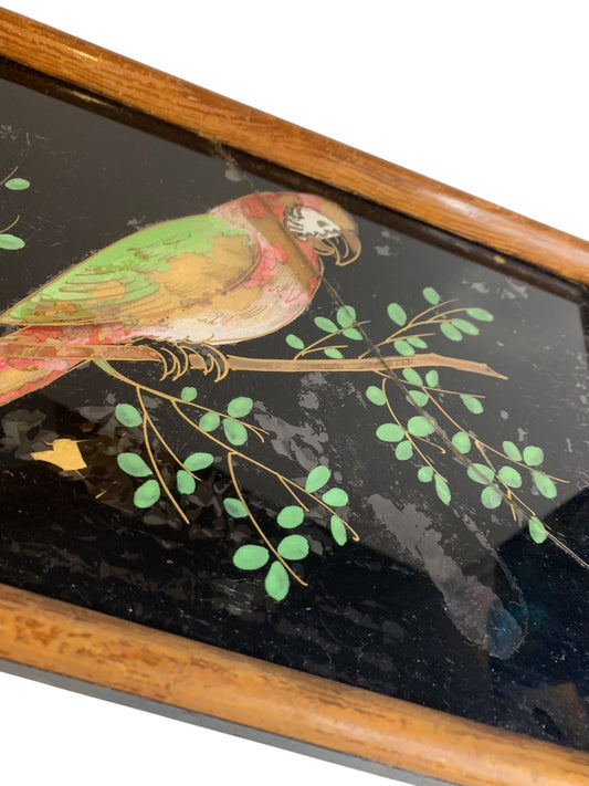 Vintage Reverse Glass Painted Parrot Handled Tray Cracked 13x8 Inches