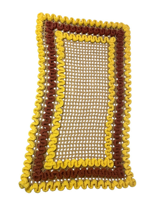 Vintage 1970s Handmade Crocheted Dresser Scarf runner Yellow Brown 29x17 Inches
