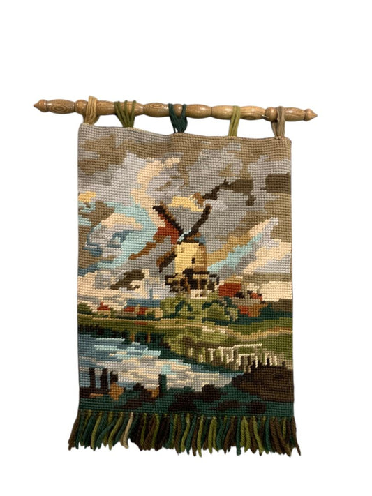 1970s Needlepoint Tapestry Wall Art Hanging Windmill Landscape 24x15 Inch