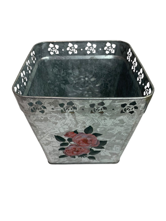 Square Galvanized with Embossed Roses Diecut Planter Vase Cottage 6 Inch New