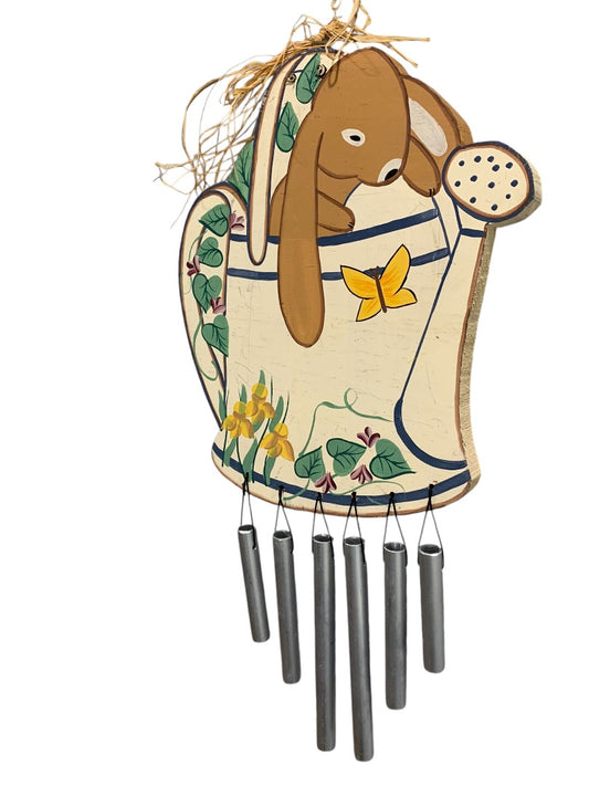 Wooden Bunny Spring Folk Art Windchimes Watering Can Signed