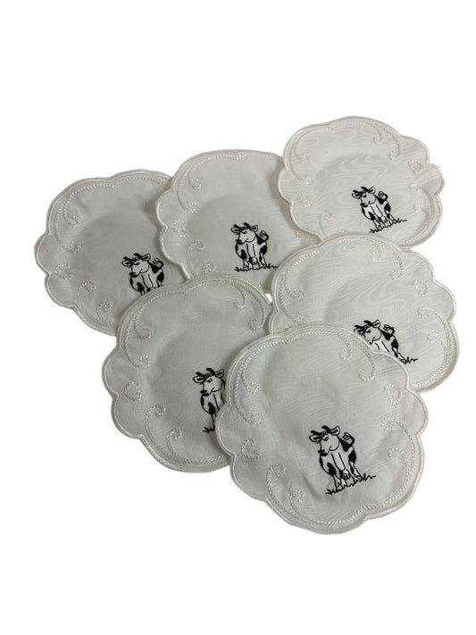 Vintage Set of 6 Doilies Embroidered Cow Linens 5.75 Inches
