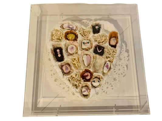 Barbara Kirschner Paper Sculpture Heart Candy Acrylic Shadowbox 1980s 12" Square