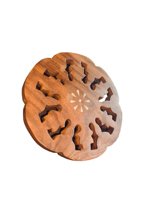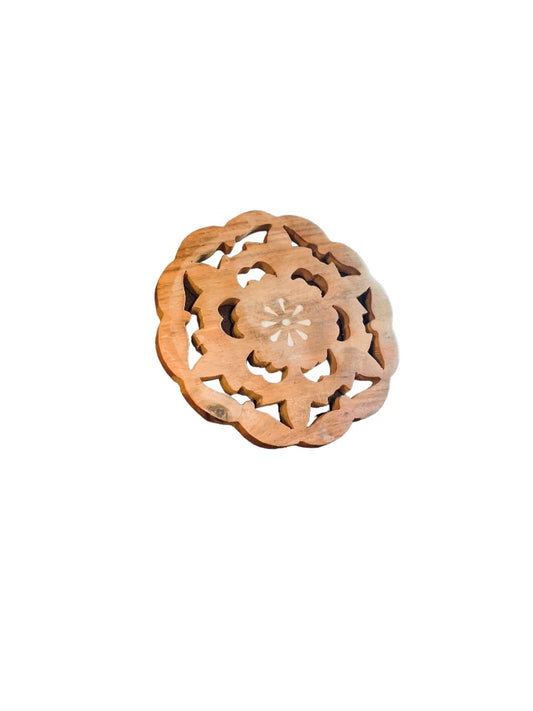 1970s Vintage Wooden Trivet 6" White Inlay Wooden Plant Tray