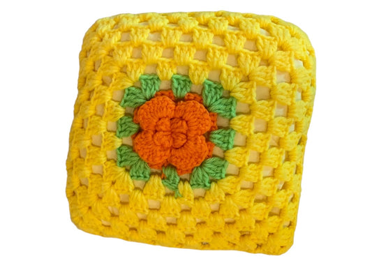 Vintage 1980s Crochet Cover Flower Throw Pillow 10" Accent Yellow