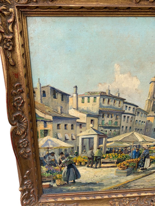 H Johanns Oil Painting on Canvas Market Day Town Square Signed 33.5" x 45.5" Framed