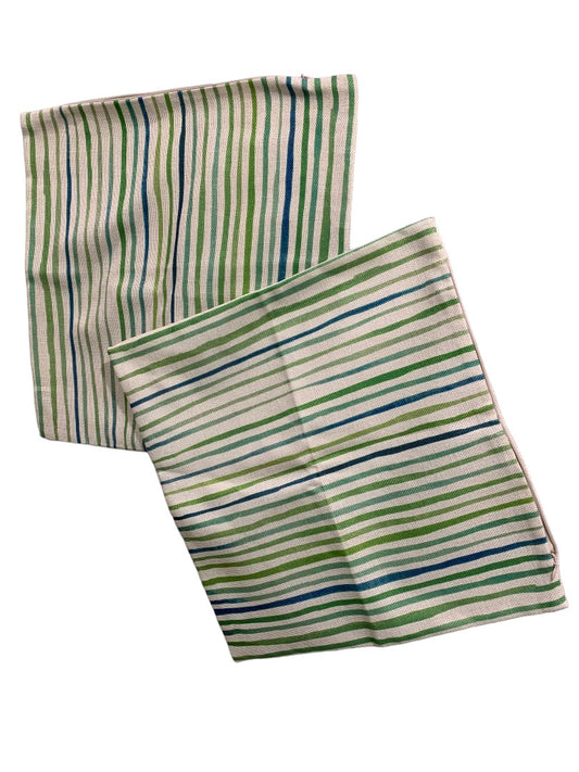 Set of 2 Pillow Covers Burlap Style Green Blue Striped 16" Square Zip Closure