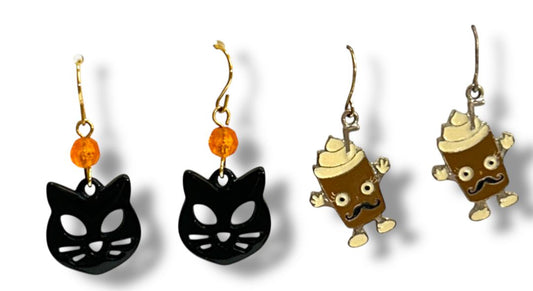 2 Pair Pierced Earrings Fishhook 1.25-1.5" Drop Black Cat Latte
