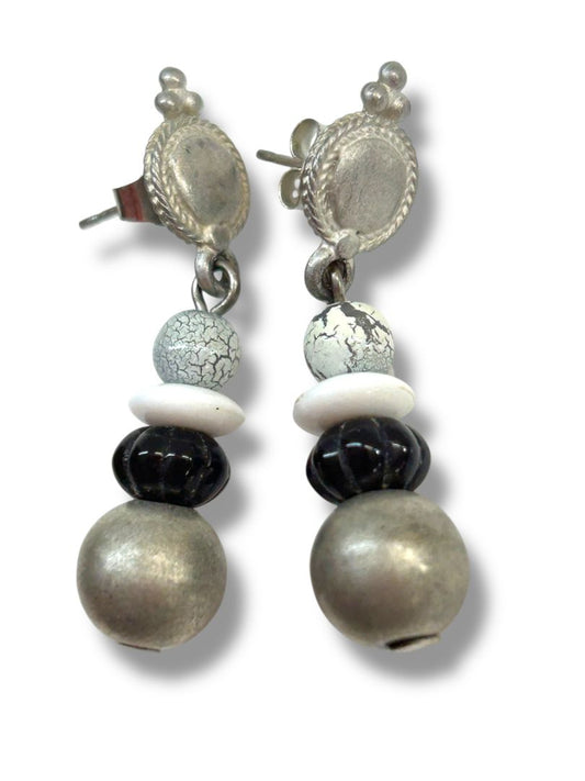 2 Pair Pierced Earrings Silvertone Black 1.5" Dangle Drop