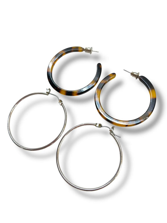 2 Pair Pierced Earrings Hoops Acrylic Tortoise Silvertone 1.5" Diameter