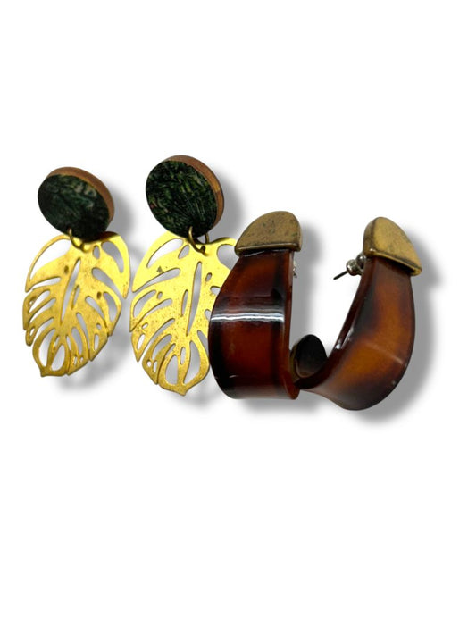 Vintage 2 Pair Pierced Earrings Acrylic Hoop Dangle Leaf