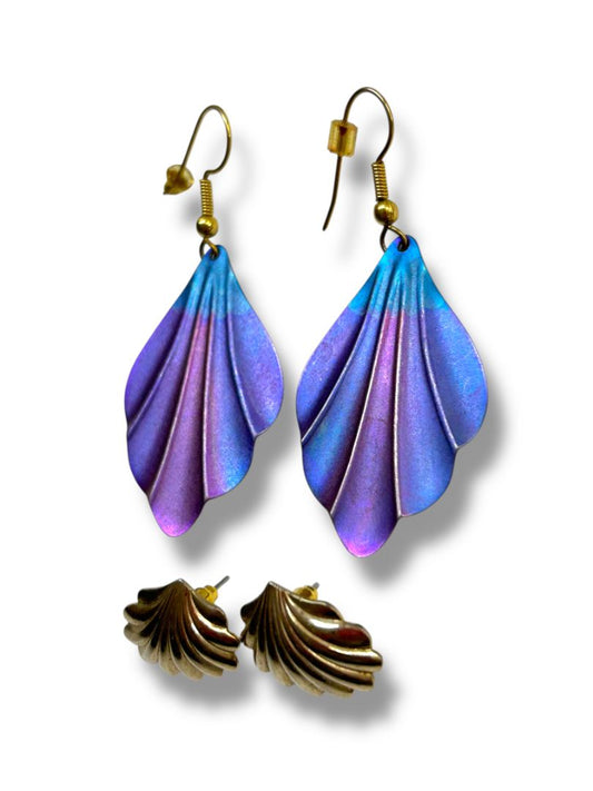 1980s 2 Pair Pierced Earrings Shell Design Goldtone Purple
