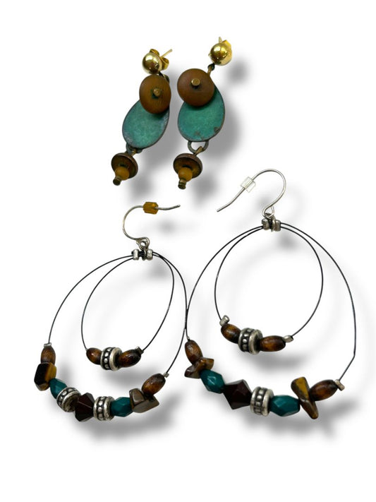 2 Pair Boho Pierced Earrings Brown Teal Dangle