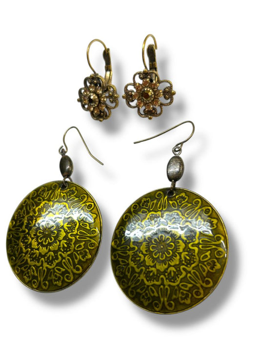 2 Pair Goldtone Retro Pierced Earrings Medallion Drop Flower
