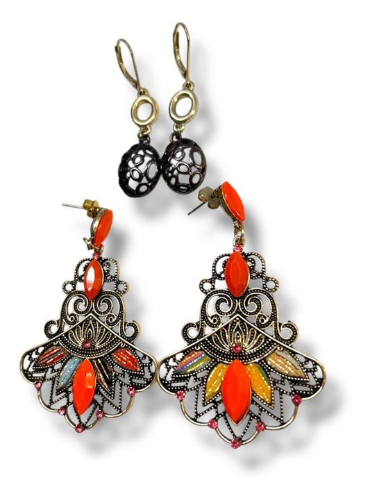2 Pair Pierced Drop Earrings Chandelier Filigree Boho Style