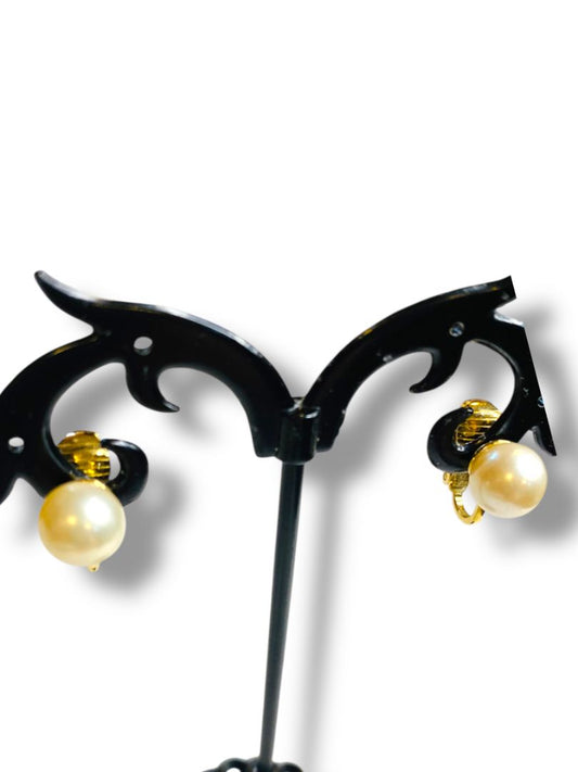 Signed Trifari Vintage Clip On Non-Pierced Earrings Goldtone Faux Pearl .8"
