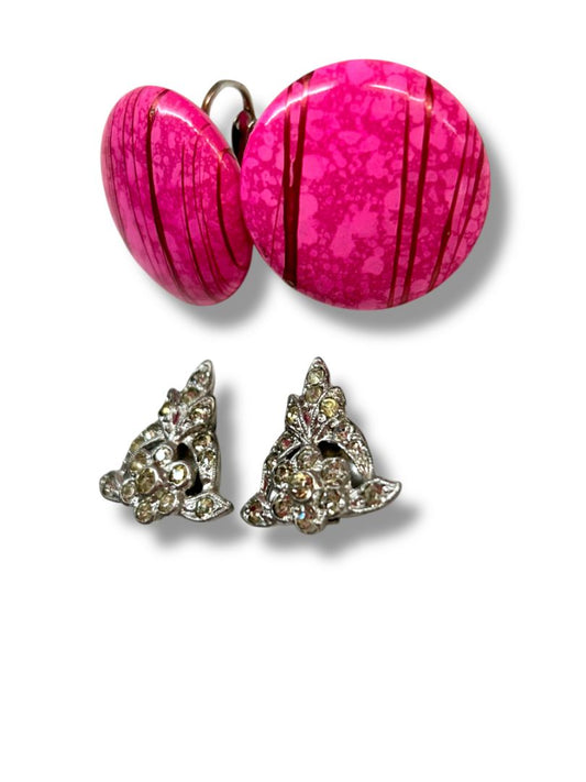 2 Pair Vintage Clip On Earrings Non-Pierced Pink Dots Silvertone Rhinestone