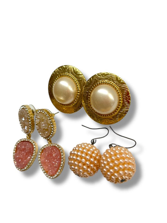 3 Pair Pierced Earrings Goldtone Pink Faux Pearl Costume Jewelry