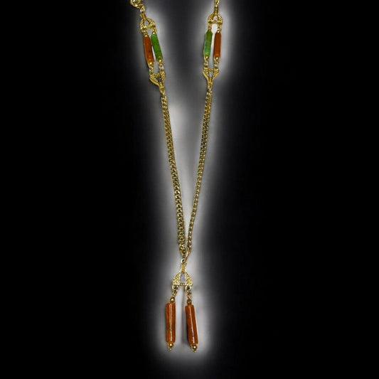 Vintage Emmons Long Tassel Necklace Goldtone Green Orange Acrylic Beads 36 Inch