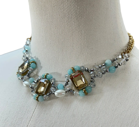 Goldtone Blue Statement Necklace 16-18 Inch Lobster Clasp Faux Pearl