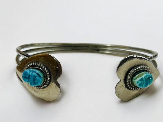 Silvertone Open Bangle Bracelet 2 Hearts Polymer Clay Faux Turquoise