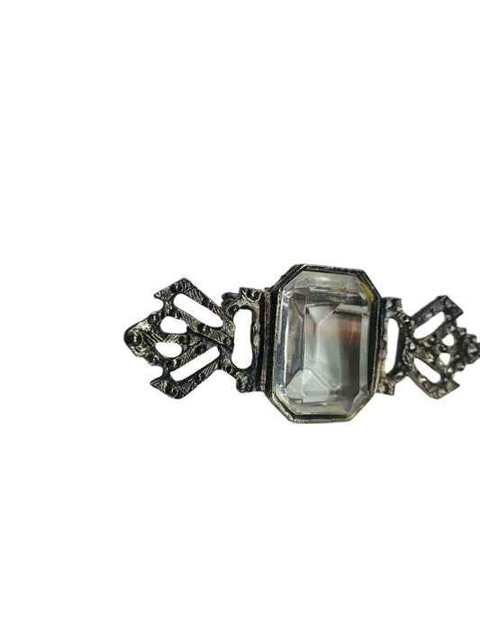 Vintage Pewter Color Brooch Pin Clear Faceted Lucite Crystal 2.8" Antiqued Look