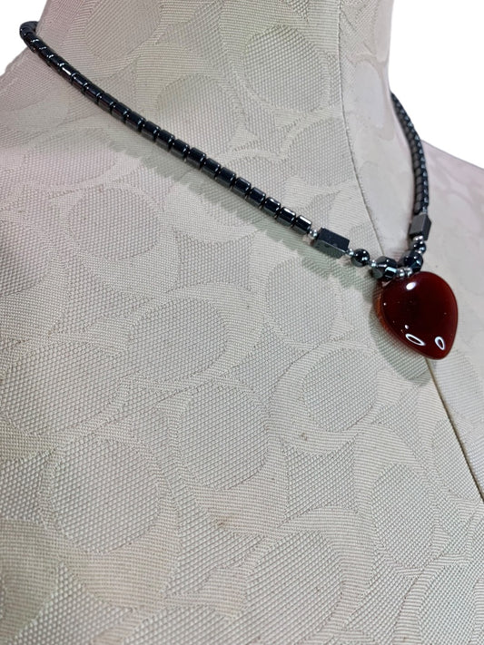 Hemitite Heart Stone Pendant Necklace Barrel Clasp 18" Silvertone Spacers