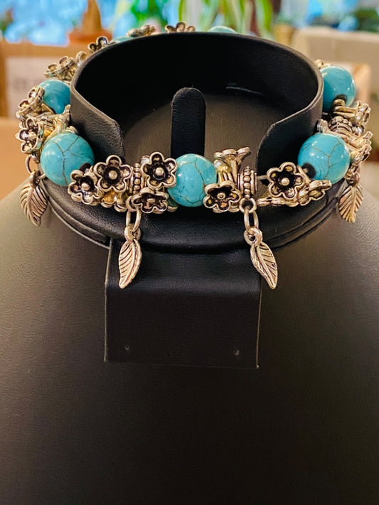 Silvertone and Faux Turquoise Beaded Stretch Bracelet Feather Charms