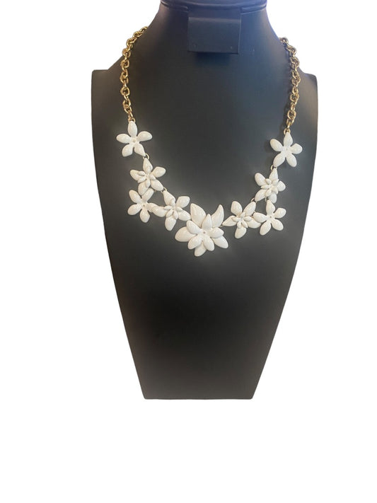 Signed Talbots Bib Necklace Goldtone and White Flower Enameled 18"-20.5"