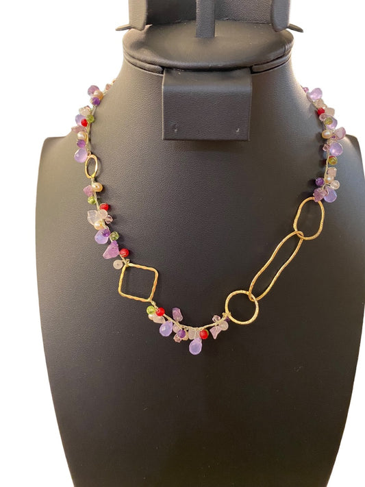 Nakamol Signed Handcrafted Goldtone and Small Stone and Pearl Necklace 17-20"