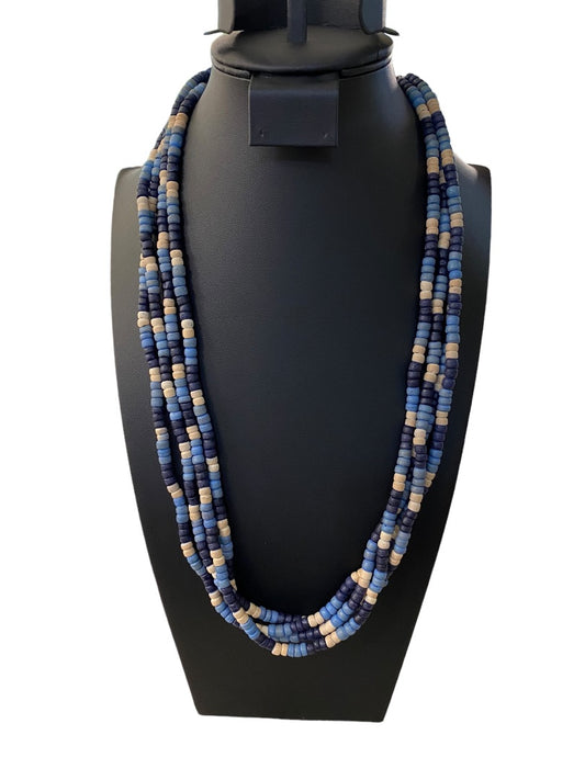 Vintage 1970s Blue Wooden Bead Statement Necklace Hook Closure Four Strand 27"