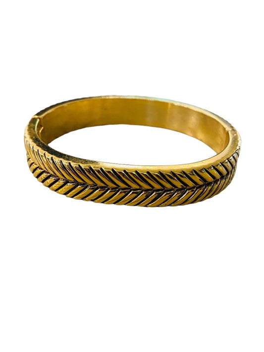 Goldtone Oval Bangle Bracelet Press Down Latch Hinged Herringbone Pattern
