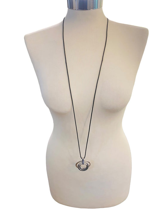 Overhead 41" Cord Necklace Distressed Silvertone Circle Pendant 2" Diameter