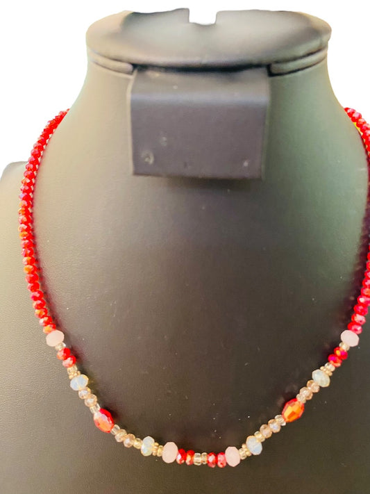 Red Crystal Beaded Necklace Clear Silvertone Necklace 18"