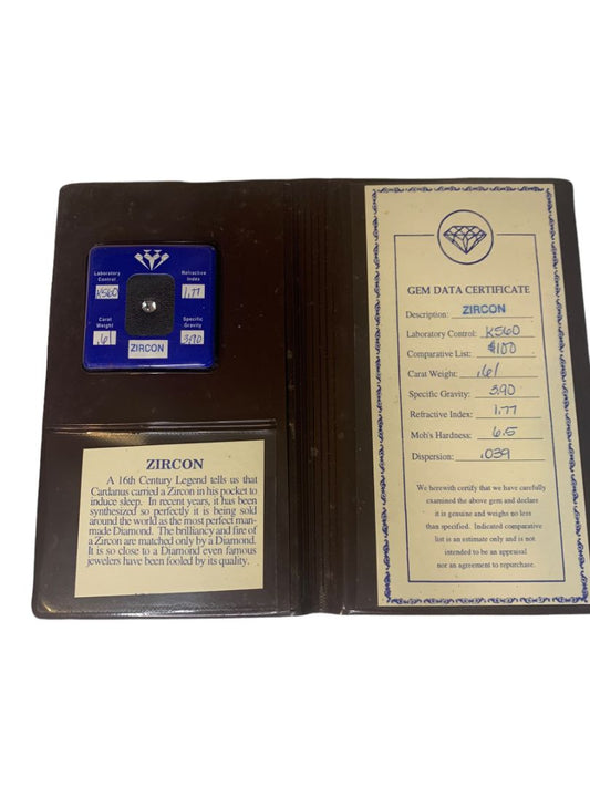 Gem Data Certificate Zircon Gemstone 0.61 Carats Folder and COA Vintage