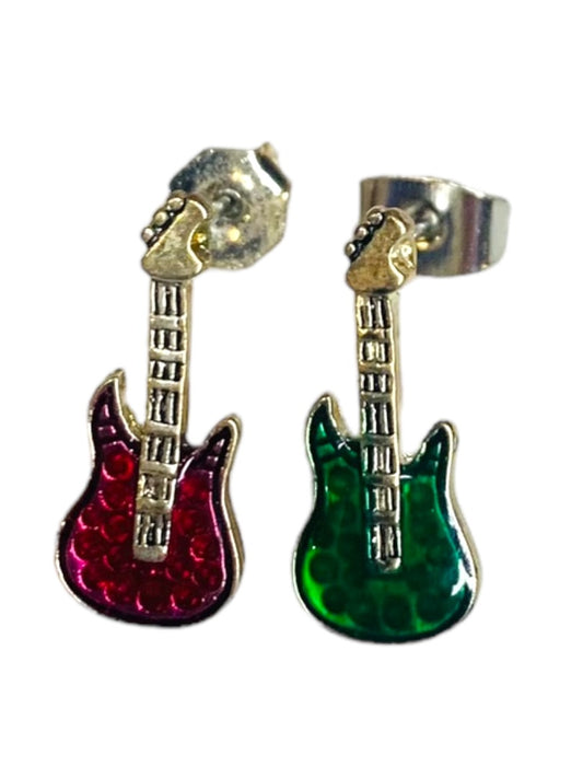 Pierced Post Guitar Earring Silvertone Pink Green Petite .5" Stud