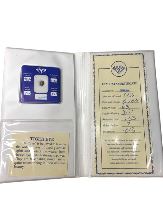 Gem Data Certificate Tiger Eye Gemstone 0.63 Carats Folder and COA Vintage