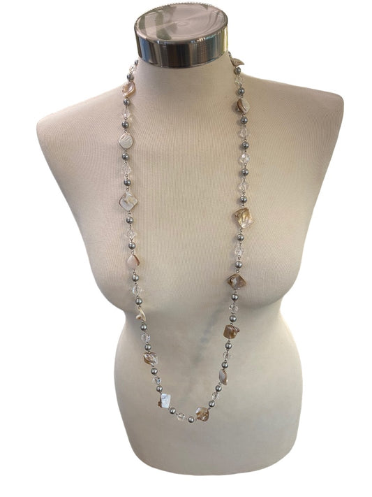 Long 44" Strand String Necklace Silvertone Shell Clear Faceted Acrylic Beads Linked