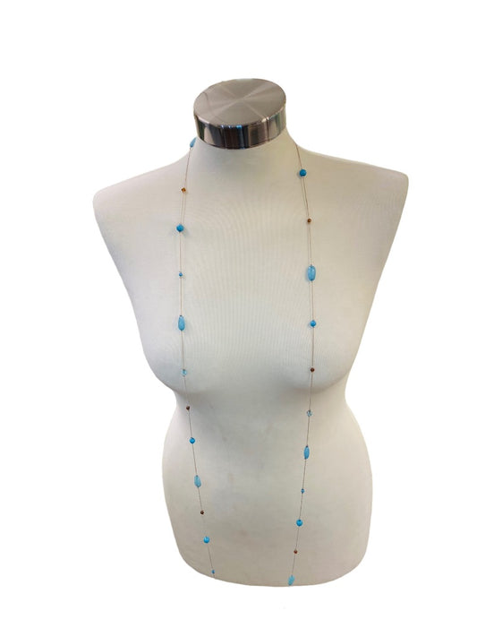 Long Strand Necklace Delicate Silvertone and Blue Acrylic Beads 60" Lobster Clasp Layered