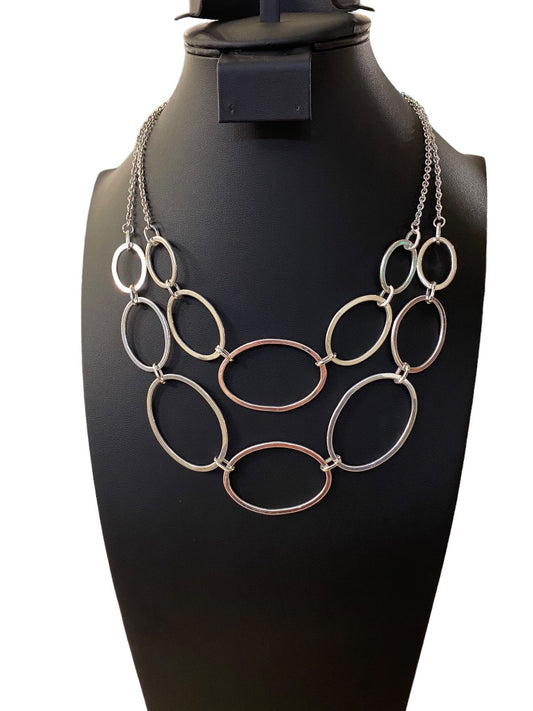 Silvertone Layered Bib Necklace 17-20" Lays Flat Lightweight Statement