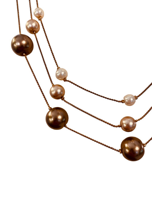 Triple Strand Necklace Layered Look Antiqued Goldtone Multicolor Faux Pearls 16.5"-20"