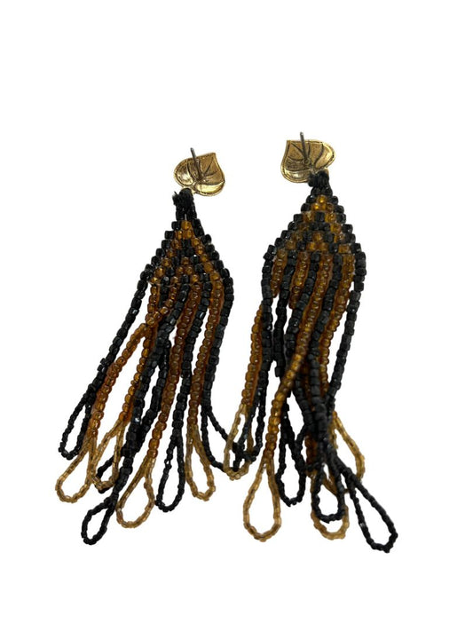 Vintage Seed Bead 3.5" Drop Dangle Earrings Goldtone Black Post Pierced
