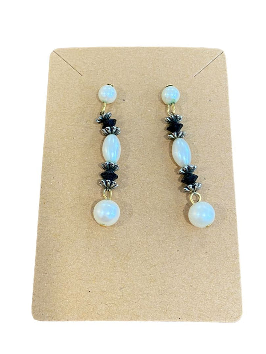Faux Pearl Beaded Dangle Black White Pierced Earrings