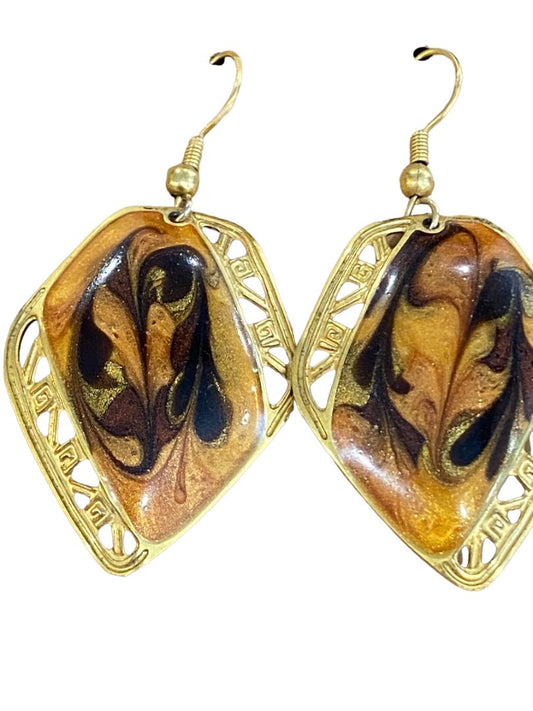 Vintage Gold Tone Retro Dangle Brown Enamel Swirl Pierced Earrings