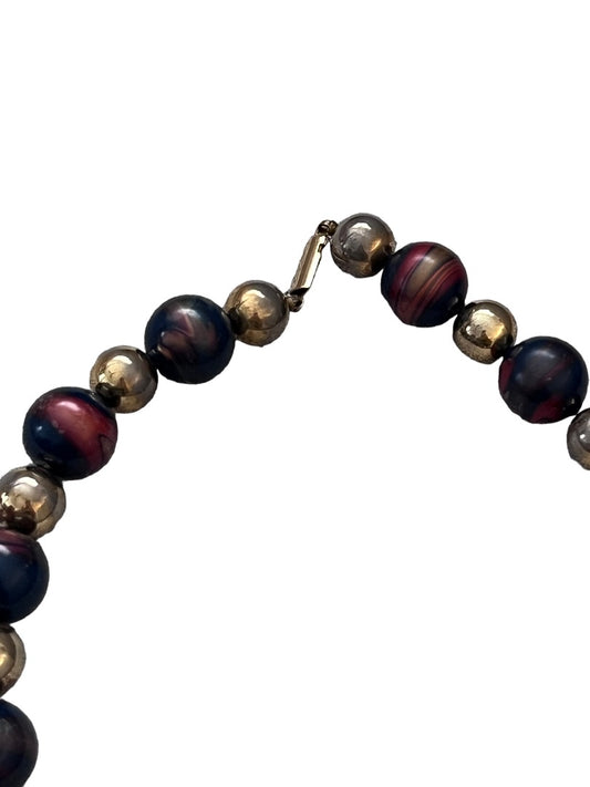 Enamel Marbled Beaded Necklace Gold Tone Navy Blue Garnet 27"