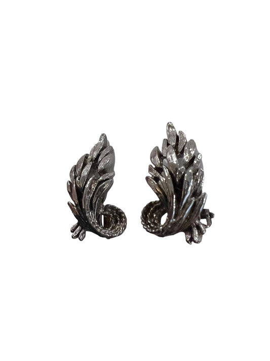 Silver Tone Pewter Clip On Earrings Plant Leaf Floral Organic Style