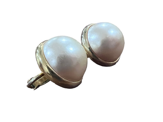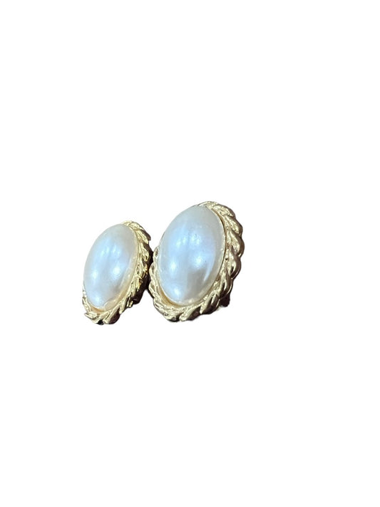 Oval Faux Pearl Cabochon Gold Tone Scalloped Clip On Earrings
