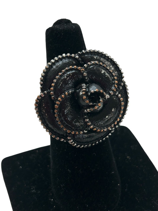Size 7 Statement Ring Black Flower Goldtone Trim Silvertone Band