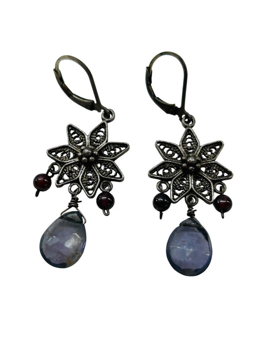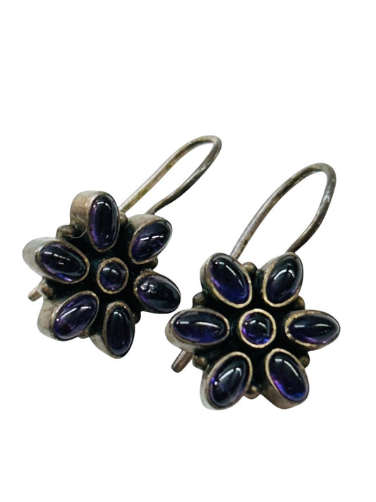 Sterling Silver 925 Flower Earrings Purple Fish Hook 1 Inch
